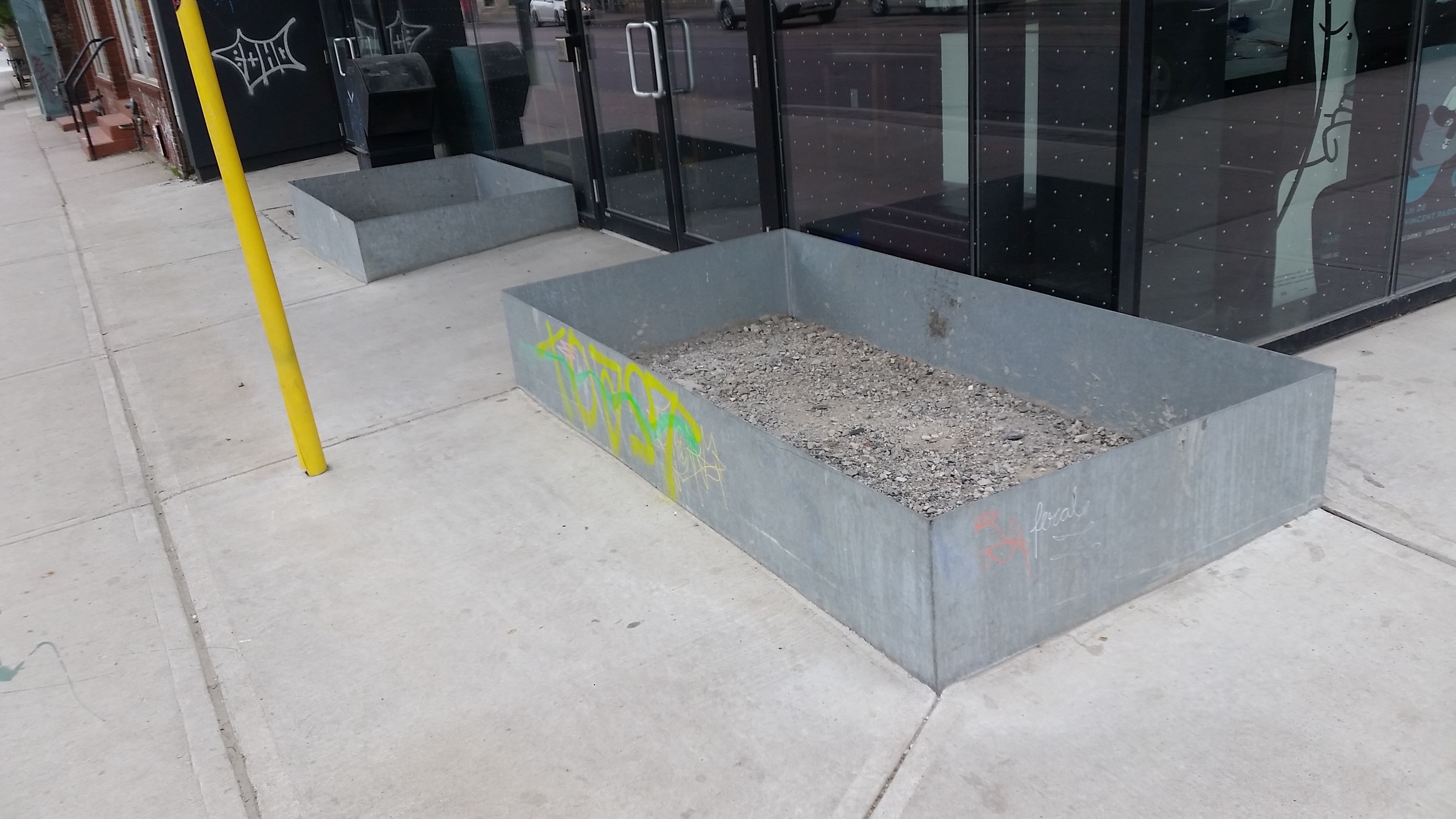 Here's a close up I took today of the two planter boxes out front of the building (at least that's what I presume they must be). This is more than 2 years after the completion of the building and they're a real eyesore. You can see the yellow plastic-wrapped wire in here as well. I should've taken a picture of the "lobby"