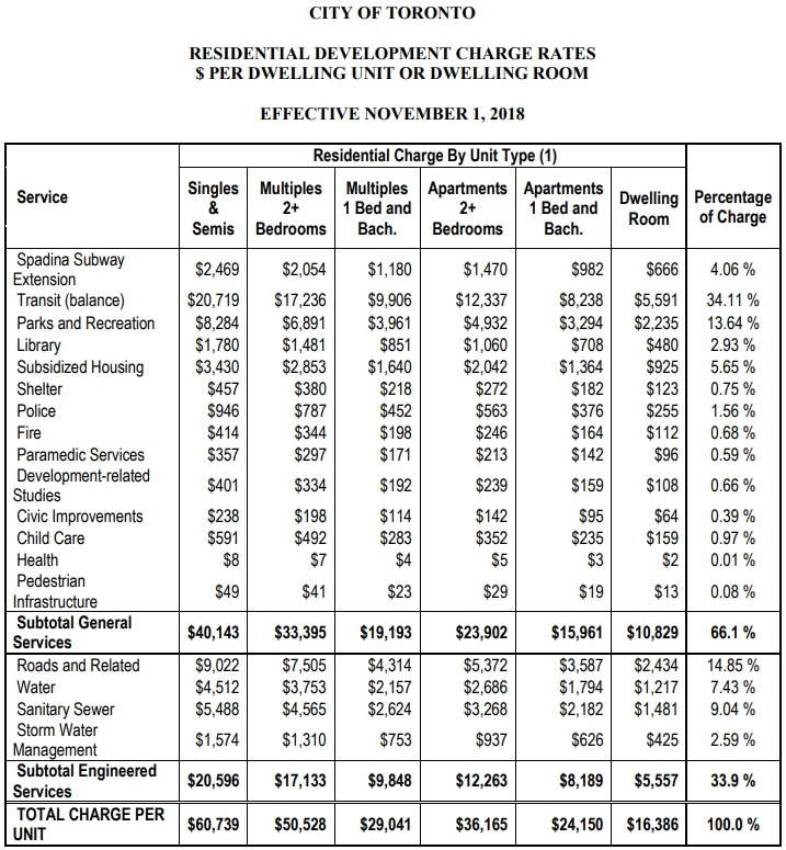 First of all, what are the development charges? Per the City of Toronto's own website, "Development charges are fees imposed on land development and redevelopment projects to help pay for the capital costs of infrastructure that is needed to service new development." The biggest ticket items are transit, roads, and parks & rec, as you can see by the able below (link).