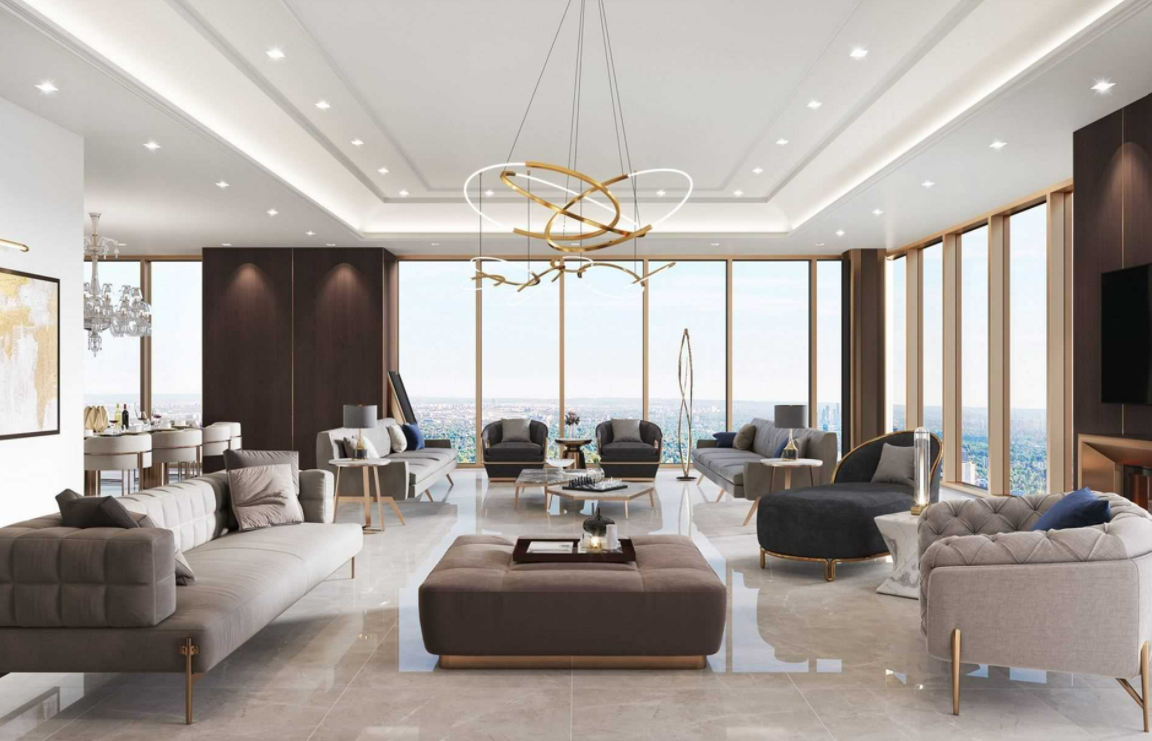 There are actually two $30 million properties the developer (Mizrahi Development Group) is selling in this building. So you're probably looking at an award winner for the 2022 Awards if either of them sell (though they'll also likely repeat on this most expensive listing award). One is this $34.7 million 8,752 sqft lower penthouse (5 + den, 7 bathrooms) on the 79th floor. The buyer has the option to customize the layout, so there are no real pictures, but you can see a bunch of renderings of what your pad could look like here. Here's how the interior is described: "Sleek interiors of marble and wood. Opulent metallic tones. Sunlight from every angle. Clean and pure. Every room showcases the glory of the view. Living high in the sky. You're the first to see tomorrow. The last to see yesterday."