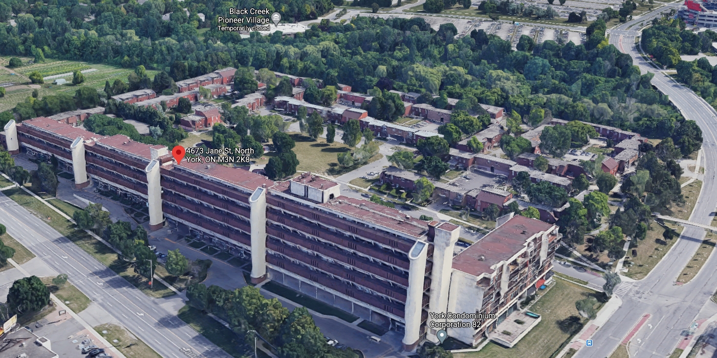 For the third year running (and probably more but I only started doing this for 2019), the least expensive sale in the city was in the same same series of four buildings. They're located right on Jane, between Steeles and Finch. The forest at the top of the picture (the photo looks northeast) is where Black Creek Pioneer Village is. On the upper right part of the picture is the tennis stadium on York's campus where the Rogers Cup is held every year.