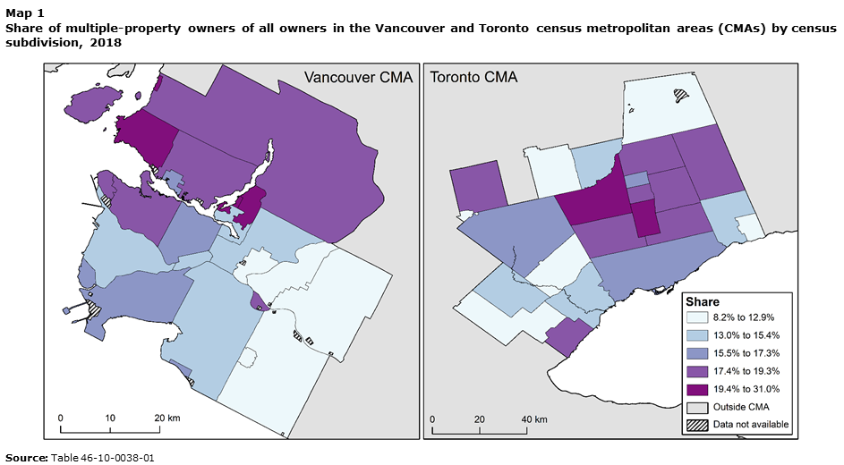 For this one I’m trying to disincentivize investors that own several properties. The more they’re hoarding properties, the less supply there is for end-users to purchase, which makes the market tighter, leading to higher prices. A Statistics Canada report from 2018 showed 359,475 multiple-property owners living in the Toronto CMA.1 And in the City of Toronto the proportion of all property owners than owned more than one property was 16.4% (highest concentrations in the CMA were King 25.4% and Richmond Hill 21.0%). That’s pictured below.