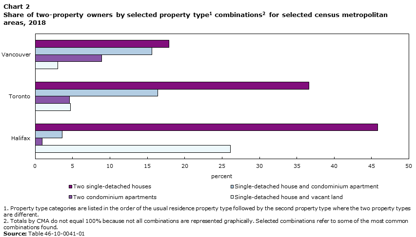 In Ontario, 76.0% of owners with multiple properties owned exactly 2 properties, 16% owning 3 properties and 8% owning 4 or more. For the two-property owners, you can see the split below. Keep in mind this is for the CMA, so the fact that two single-detached is the most prevalent combo could be somebody that lives in King City and owns a second property in Markham. I’m not sure what the split is for just the City of Toronto (416), but I’d bet condo combinations are a lot more prevalent.