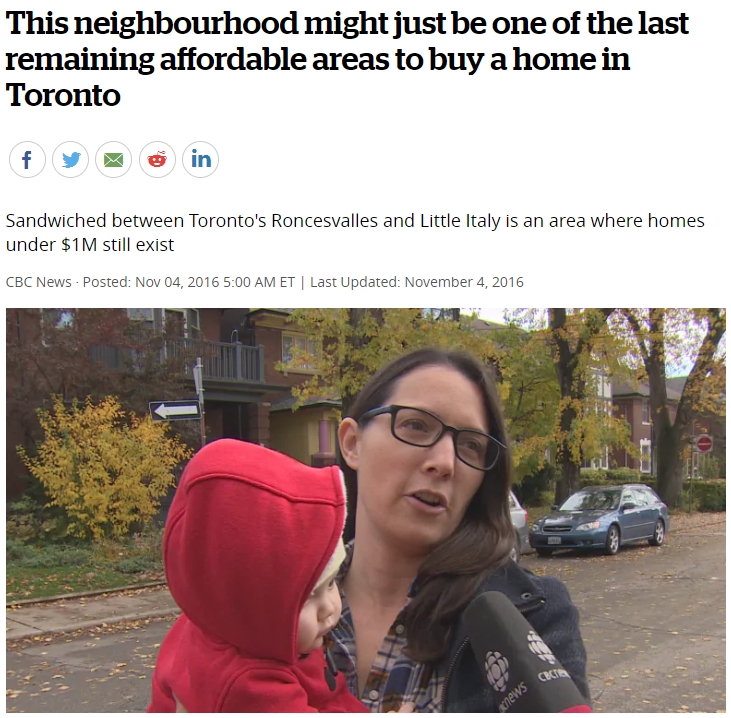 Right off the bat, it tries to grab you with "This neighbourhood might just be one the last remaining affordable areas to buy a home in Toronto." Though it says "Toronto," the article only discusses the Dufferin Grove neighbourhood, located southeast of Bloor & Dufferin. So we're dealing with a very downtown-centric or south-of-Bloor-centric viewpoint. Dear author: prices in Toronto (the whole 416) do get a lot more "affordable" as you move away from the downtown core.