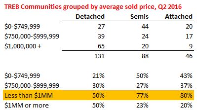And don't forget about the whole rest of the 630 km2 city. Here is Q2 2016 sold data from the Toronto Real Estate Board (TREB).* There are 137 TREB Communities (what you and I call neighbourhoods) in 35 TREB zones (C1, W10, E9, etc.) all over the 416. While this includes your downtown favourites like Trinity-Bellwoods, it also includes everything from Agincourt North to The Beaches, to Black Creek and Mimico.