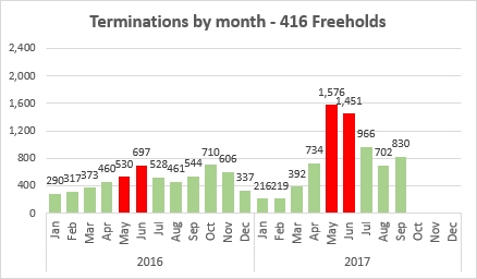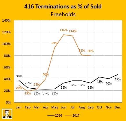 There you go again with the rise noticable in March, the big spike in April, then easing off as sales volumes started to rise, but not it's heading way up (October to date is 163%). You may wonder why I am not showing 5 years of lines here like I did for Freeholds. Well that has to do with how the MLS system works. I can pull these numbers for the last 24 months, but if I try to go into the "archived" data it's not really possible. With Freeholds I'd been watching the numbers since 2016 and had looked in again after, so I had the termination and suspended numbers already. With Condos I didn't so you're only geting a 24 month view. But from what I saw in 16 months of data 2016 and 2017 I'm very confident these are recent-year highs.