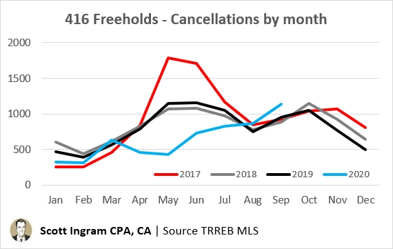 Well that depends what segment of the market you're looking at. You'll note from the charts at the top that my 2017 look concentrated on Freeholds, because that's the segment of the market that was rapidly changing (particularly detached houses which are about 70% of all 416 freehold sales). This time around I'm looking at all active cancellations (terminated + suspended). Note that 2017 (red line) still looks wild in terms of total cancellations, especially May (1791) and June (1713).
