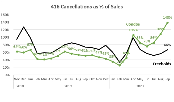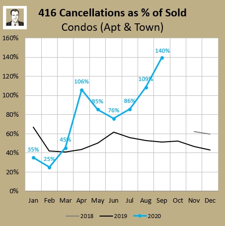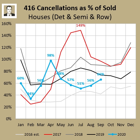 But 2020 (blue) tells a different story than you get out of just looking at absolute canceallation numbers. Here you can see a big change in direction in March and a spike in April, as the absolute cancellations stayed about the same (as shown previously) but the sales fell right off. Then the market for freeholds tightened, and lately you see here signs of it easing off again (and continuing into October as the month to date number is 72%).