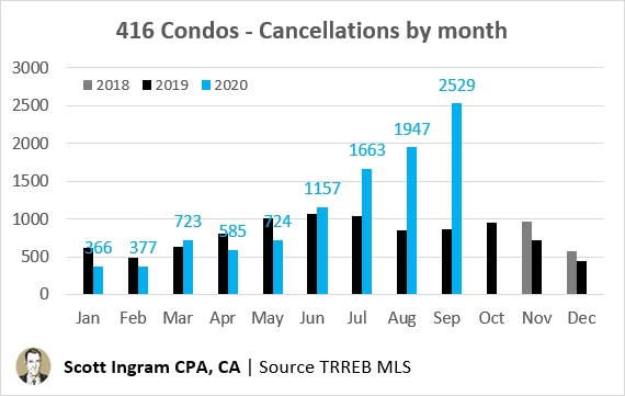 Here's how the absolute numbers of cancellations have been trending in condo land (which includes condo townhouses as well, but condo apartments are about 85% of total condo sales):