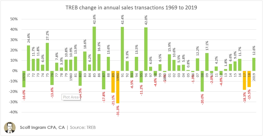 TREB pointed out in its press release that "2019 sales were in line with the median annual sales result for the past decade." The 10 year median was 88,461 so that's not far off (0.7% lower). That's a more positive spin than it was 3.7% below the decade average of 91,244. But really that was driven by a crazy 2016 spike so I do in fact see it as a return to normal. Though you can see it's below the long term trend line.