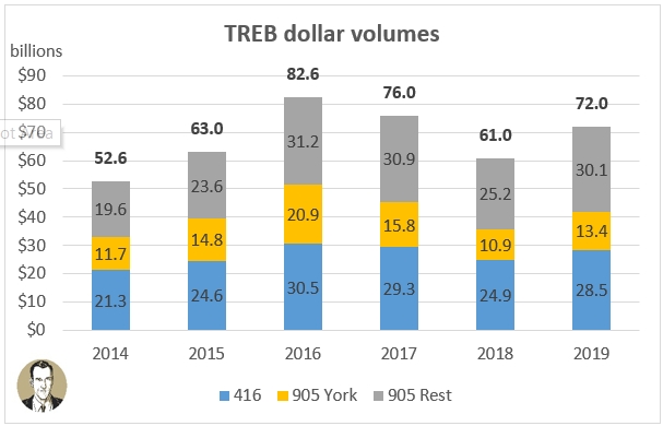 Switching to dollar volumes, we can see that overall TREB volumes rebounded by $11 billion, to increase 16% over 2018 levels.