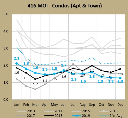 For 416 freeholds, the 1.6 MOI for December is the 5th lowest in the last 24 years. You'll note a similar pattern to condos in that the first 3 months started out higher than 2018, before dropping below (though 6 months for condos). The first 8 months were higher than the average of the last 7 years, then spent a couple of months at the average, before dipping below the average in the last two months.