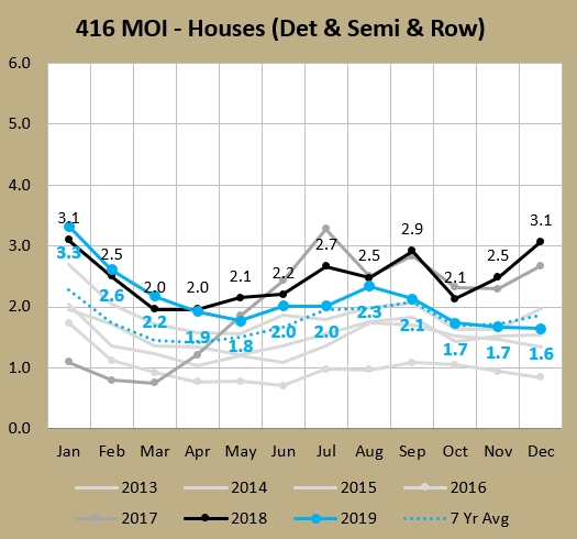 The December MOI for 416 condos is the second lowest December ever (or at least the 24 years in which I have data), trailing only 2016. Interestingly this year started out with higher MOIs than 2018, which looked like a bit of an easing in the condo market. The 1.27 has only been lower once in the last 31 months (1.19 in March 2018).