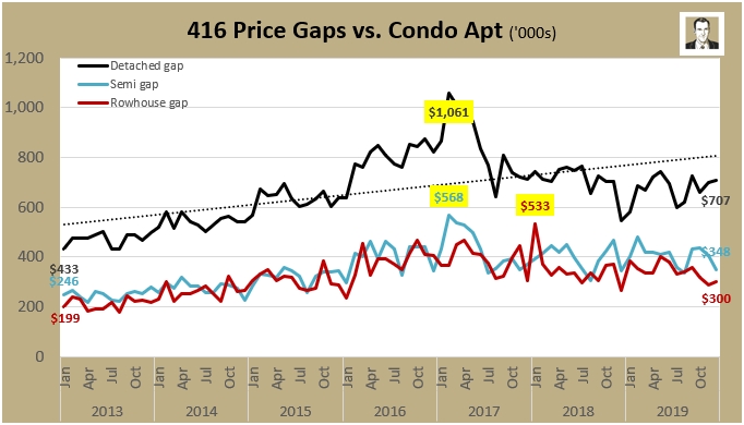 For those thinking of moving from a box in the sky into a lowrise house with a white picket fence, how is that looking? Well, if you live in an average-priced 416 condo are hoping to buy an average-priced 416 detached, the price gap is currently $707K. The good news is that hasn't really moved much in two years (December 2017 was $712K).