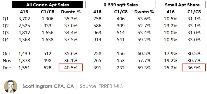 There was definitely a rise through the Q4 months in the share of downtown sales, rising every month from the 34.4% Q3 average, to a big jump in December to 40.5% of all 416 condo apartment sales being in TRREB's C1 and C8 zones (south of Bloor, Dufferin to DVP). And I've also highlighted that share of small apartments as a percentage of all sales took a big leap from Q3's (and October/November's) 31% to be 37% in December.