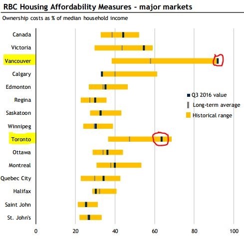 Toronto on the other hand remains, in the words of the RBC report, "fueled by a vibrant regional economy, strong demographic flows and continued investor interest". Demand remains above last year's levels while supply is at levels 50%-70% lower than 2015, so there upward pressure on pricing remains strong. So with prices increasing, mortgage payments will increase, and Toronto's 63.7% number will edge closer to Vancouver's.