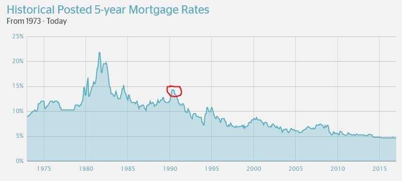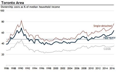 For point of reference, the median "family" income for Toronto in 2015 was $75,270. The biggest driver in ownership costs is mortgage payments. Looking back at that peak in the spring of 1990, the Bank Of Canada 5-year fixed rate was 14.25%. At the end of Q3 2016 it was 4.64%. so current cost increases are being driven more by the amount of the mortgage than the rate of the mortgage. (RBC is using a 25% down payment and a 25 year mortgage at the 5-year fixed rate.)