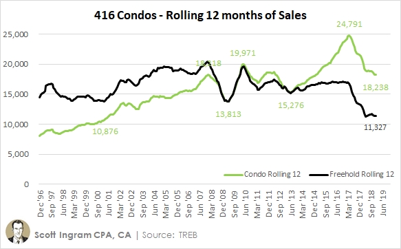On a couple of important measures, freehold (i.e. non-condo) sales are the worst in 10 years. On some, like sales, 416 freeholds just had the worst year in the last 23 years. But note 416 freehold volumes never really spiked, even in 2016 which was a record year (by far) for transactions in the GTA. If we look at condos on the other hand...
