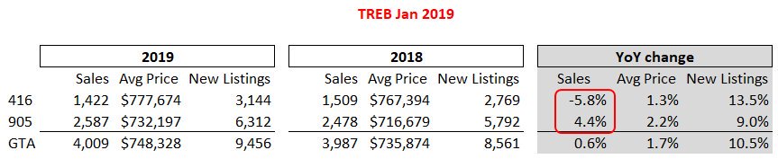 You all know the big hullabaloo over the stress test on insured mortgages (20% down or more) that came into effect on January 1, 2018 and got a lot of blame for the slow year last year (77.4K GTA-wide transactions for the year, 16% below 2017's number, and the lowest year since 2008). Well, November and December 2017 had a lot higher sales than they would've normally because people were rushing to beat the stress test. So 2018 started out low in the first couple of months because some of those transactions were pulled ahead into 2017. So if things just returned to "normal" this year, January 2019 transactions should've been higher than January 2018. So the fact the GTA was only up 0.6% and that the 416 was down 5.8% is worrisome.