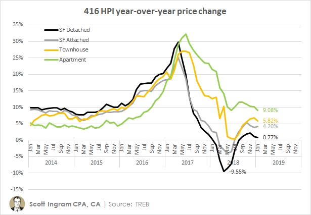February generally sees a large bump in average prices, which I call the "February bump." You can read about it here. In the last 23 years, Feb freehold prices increase 8.5% over Jan prices, and 21 of the 23 years have increased. The only exceptions were the first year I have monthly data for (1996) and last year (2018), so it broke a 21 year streak. Again, volumes last Feb were depressed due to the pull-forward of stress test beaters, so if Feb sales volumes don't increase YoY then that's bad.