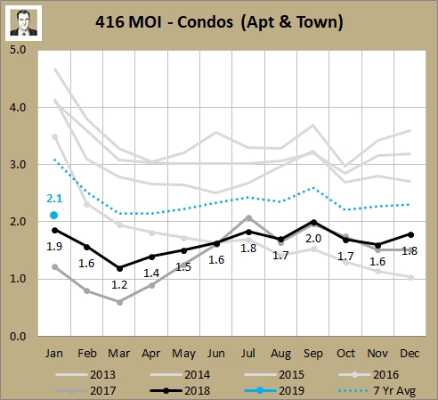 It's not a new observation. The December report had a section called "Condo weaknesses beginning to show." It's just definitely something I'm monitory closely now. One other stat for condos I wanted to show is Months of Inventory (MOI). It was at 2.1 in January. That's still really low historically (a full 1.0 months lower than the 7 year average), but it's only the second time in the last 35 months that it's gone above 2.000. It's also still lower than the freehold MOI of 3.3, a record 23rd month in a row condo MOI was lower than freehold MOI. So it still has a way to go to be a cool market, but it appears to be cooling.