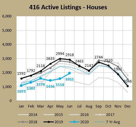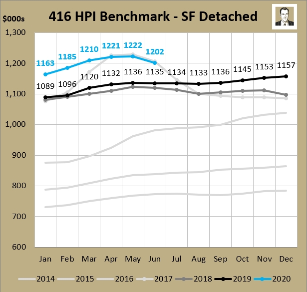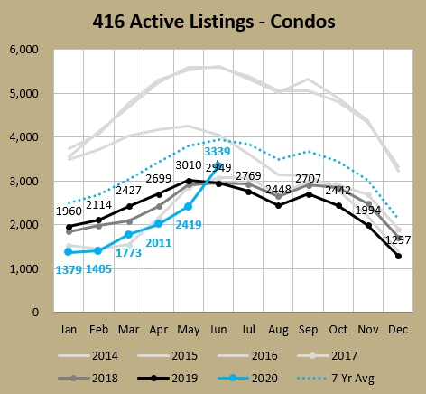 Every month recently has been a lot different than the prior. In February things were hot. March was a tale of two halves, with the first half continuing hot, and then the brakes coming on in the second half after all three levels of government started implementing COVID-19 measures. Then April was one long month of riding the brakes, with 2,975 GTA sales representing the lowest April in the last 25 years (as far back as TRREB supplies monthly numbers for). May was the start of recovering. and June just happened and it continued the trend of sucking less bad than the prior month.