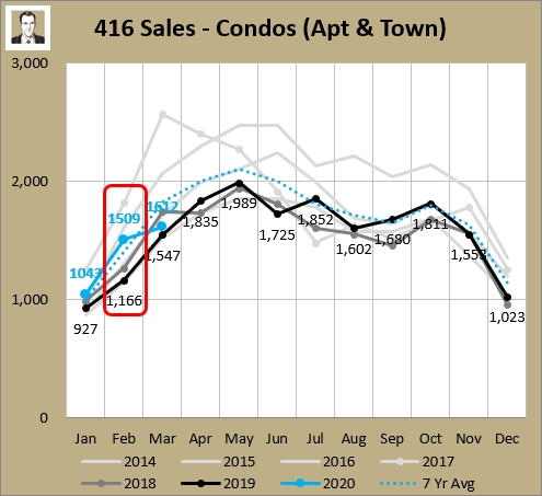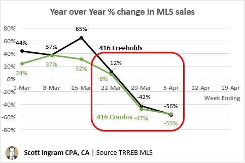 In February, 416 condo sales volumes were up 29% over February 2019. In March that slowed to just 4% over March 2019. In April it will be below, with early indications showing it might even be just half of the prior year's volumes.