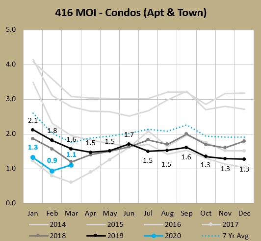 The relationship between supply and demand is shown in months of inventory (MOI). The formula is active listings (snapshot at the end of the month) divided by the sales velocity for that month. At the end of March there were 1,773 active condo listings in the 416, and for the month of March there were 1,612 sales recorded. That works out to an MOI of 1.1, as shown below. It's saying at the current pace it would take just over a month to sell all the condos currently listed.