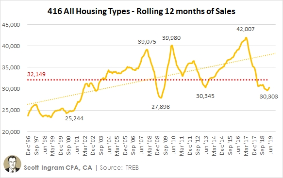 In the rolling 12 month look, you can see freehold sales have stabilized within +/- 250 transactions of 11,750 for the past 14 months, since April 2018.