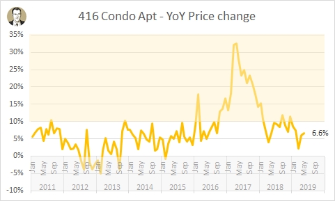 The 6.6% YoY price increase is close to inline with the 20-year CAGR for condos of 7.0%, and not all out of wack and due for a regression like the crazy recent peaks into the yellow zone above (greater than 10%).