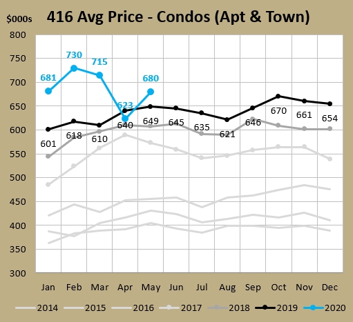 I have been tracking a lot of things weekly, on Twitter, during COVID-19. One thing I haven't been tracking is prices, though I often get asked "What about prices?" That's because sample sizes in a week are too small (in my opinion) to be meaningful. Volumes, sure. But prices really depend on the underlying mix of homes, and that could easily shift from day to day and week to week. But let's look at prices now., first for 416 Freeholds.