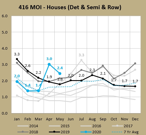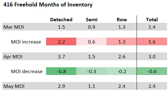 And if you recall the price charts above, they did move rapidly in the inverse direction of the MOI changes. Freehold MOI was sitting at 2.4 at the end of May, which isn't too far off the 2.2 average of the last 25 years.