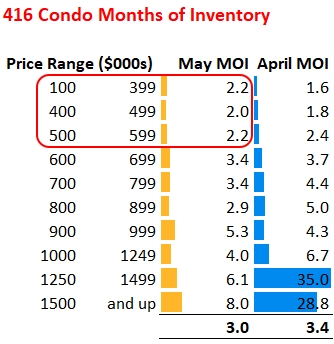 The same thing is holding true in the condo market, though the MOI numbers there are a bit higher. And most of the price points came down from April to May, especially the high ones.