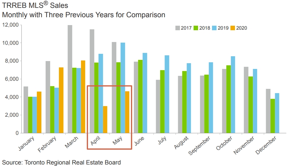 Every month recently has been a lot different than the prior. In February things were hot. March was a tale of two halves, with the first half continuing hot, and then the brakes coming on in the second half after all three levels of government started implementing COVID-19 measures. Then April was one long month of riding the brakes, with 2,975 GTA sales representing the lowest April in the last 25 years (as far back as TRREB supplies monthly numbers for). May was a bit of bounceback month (GTA sales climbed to 4,606), but it's a long road back to normalcy (those sales were 54% lower than May 2019).