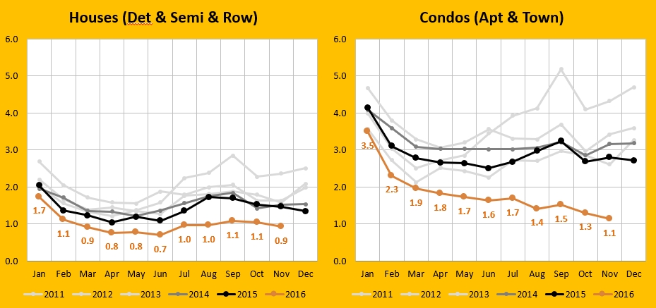 How is the Toronto real estate market doing? Well, it's really two different markets: houses and condos. And they have different supply and demand factors and so behave differently. So instead of lumping $2 million houses in with $400K condos I've separated them, and instead of lumping properties from Burlington to Innisfil to Whitby together, I've pulled out just the 416 as it's like the middle of the cinnamon roll.