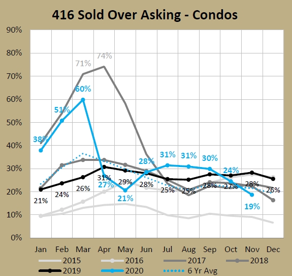Nothing new here, just that it keeps continuing. Finally, one of the last indicators to look worse has crossed over. Just two months ago, 30% of 416 condos (apartments and townhomes) were selling for over asking, which was the highest September in the last 6 years (which is safe to say is the highest ever since this method of selling is a fairly recent phenomena - especially in the condo segment). Now, two months later and it's 19% which is lower than any recent year except 2015, before this pricing strategy really took a foothold.