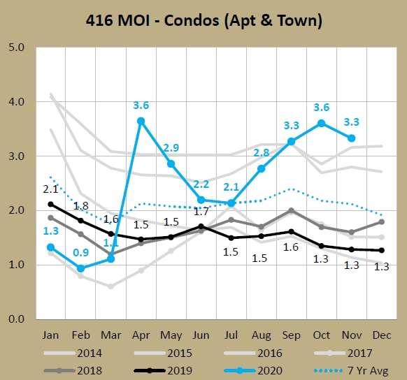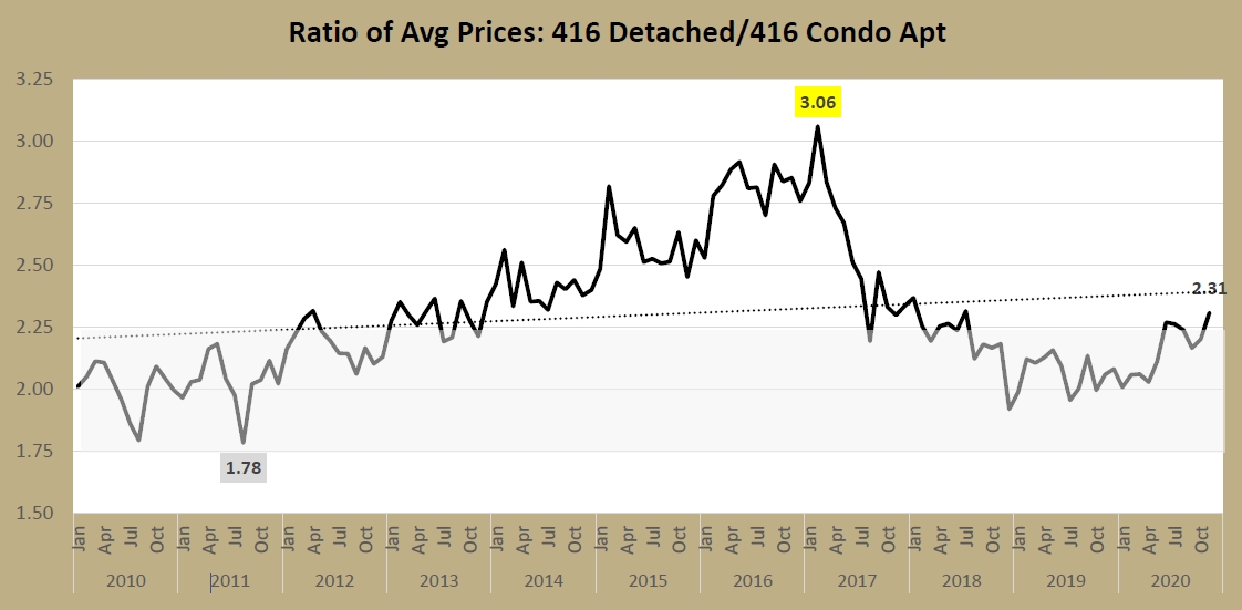 One of the things I track is the ratio of Detached prices to that of Condo Apts. Detached is about 70% of 416 freeholds and Apartments are about 90% of 416 condos so they're about 80% of sales transactions. And many people use condos to enter the market and get on the "property ladder," then trade up to a detached home once they've built up some equity. So it's interesting to track the relation.