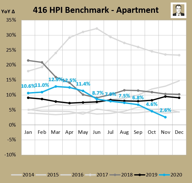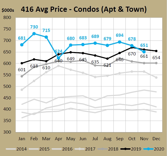 Where 416 freeholds dug their sales volumes out from a low of -28% YTD to be sitting at up 3% YTD, 416 condos bottomed out at -26% YTD at the end of May. They have clawed back, but still sit 10% lower than YTD November in 2019, a difference of over 1,700 sales.