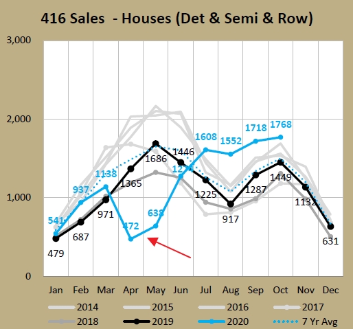 It's pretty crazy to look back at that sales hole from April (-65% YoY) and May (-62%). Heck, even June was -12%. The sales transaction deficit bottomed out at the end of June, with sales 1,634 behind 2019, 25% lower. And yet, with a strong last 4 months freehold volumes are now ahead of last year's YTD October volumes by 1%. I wouldn't have guessed in May that we'd have dug out of that spring hole by the end of the year, let alone by now.