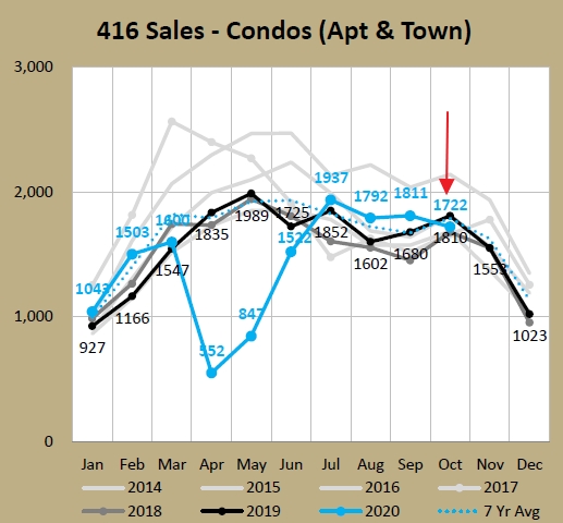 While it increasd over the month of October, the rate slowed a lot. The 416 condo active listings at the end of October grew by 268 over the end of September, but that's a lot slower than the 958 net added in the month of September. The condo inventory has finally started inching down for the last couple of weeks, which is totally normal for this time of year. A serious second wave (or are we at third?) could mess up these numbers, but at least we have some stability from the Bank of Canada who have indicated interest rates are not going anywhere for awhile.