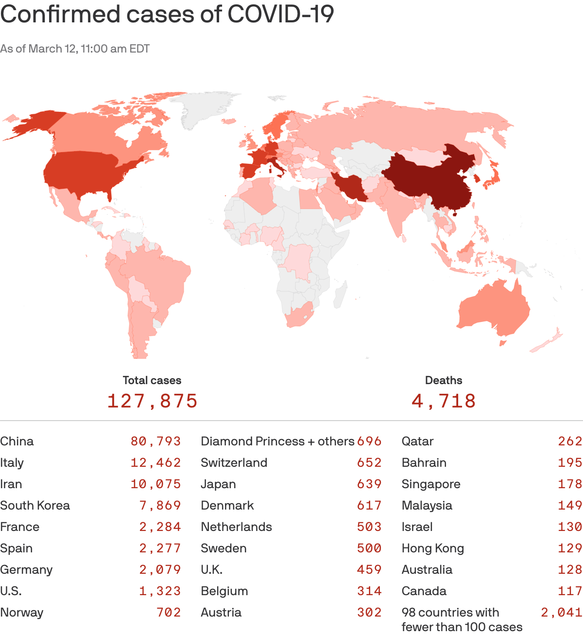 The COVID-19 stats are as of March 12, 2020 and taken from the above map source, Axios. Format below is COVID-19 (SARS):