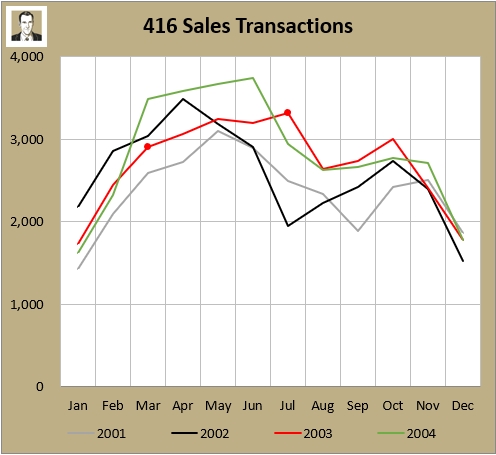 First a look at sales. These are for freeholds and condos, but just for the 416 (not the whole GTA). I've got the SARS year, 2003, in red, and then a couple of years leading up to 2003 (grey and black), then the year after (in green). The dots I put on to highlight the start (March) and end (July).
