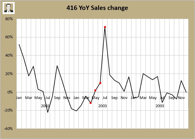 The first couple of months of 2003 were already below 2002 for sales transactions. So the fact March and April were below doesn't seem to tell me anything. Then May, June, and July were up over 2003 (July was particularly strong in this 4-year view). On a year-over-year (YoY) percentage basis it also doesn't seem to have any ill effects in the March to July period, with 4 of those 5 months increasing over the prior months on a percentage basis.