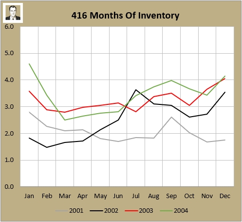 Again I'm not seeing much. It's true that the 5 months in question had a higher average MOI (3.0) than the other years (2.8 for 2004, 2.3 for 2002, 1.9 for 2001) but again it started higher in Jan and Feb anyway. Plus it only varied by 0.3 months in that time, while 2002 increased by 1.9 in that same 5 month period, and 2004 by 0.9.