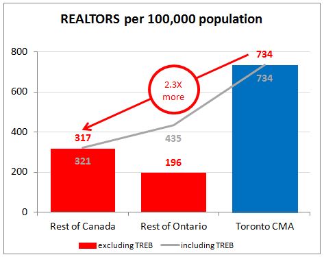 The population of Canada in 2015 was 35.9 million people¹. The number of REALTORS® nationwide is currently 115,000 (per Canadian Real Estate Association). That's a lot of Real Estate Agents. Going by that per capita rate, you would expect the Toronto Census Metropolitan Area (CMA) with its population of 6.13 million¹ would have about 19,700 REALTORS®. But there are currently (at time of writing) 45,000 REALTORS® per the Toronto Real Estate Board (TREB). That's 39% of Canada's Agents for 17% of the population!
