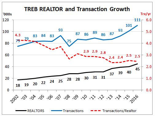 When people hear about Toronto's RECORD SALES years and CLIMBING PRICES, many figure REALTORS® are living large. Certainly, top agents are rolling in it. But even the large transaction growth in the last couple of years (to an extrapolated 111,000 for 2016²) are no match for the number of agents hopping aboard. There are about 100 new agents joining every week now. Over the 15 years shown below, transaction growth has been 2.9% per year, but the growth in the number of agents has been 7% per year. Hence, the red line below has declined from 4.3 transactions annually back in 2002, to only 2.5 transactions annually year for the past couple of years.
