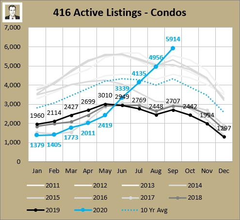 That's a lot of condos! Now I keep saying that those 5,000-plus you saw every September from 2012 to 2015 (average of the 4 years was 5,251) was more the normal and the last few years (2,707 in 2019) was the weird divergence. But we've blown past the old norms and are still climbing, so this is abnormal. Other point is that with more built condos and a higher population than there was in 2012, you would think the amount of active listings would have increased over time anyway.