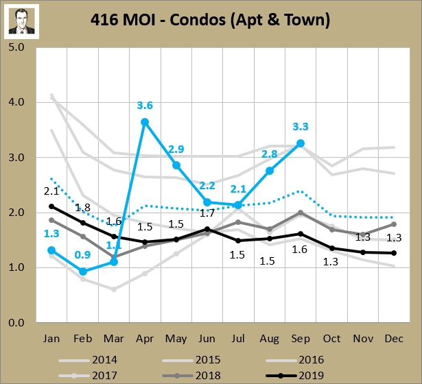 The reason all this choice (for buyers) and competition (for sellers) is making the market soft is because the sales aren't rising in step. There were just 20 more condo transactions in September over August, but meanwhile 958 active listings were added over the month. So that's going to drive months of inventory (MOI) up, which indicates a softening market.