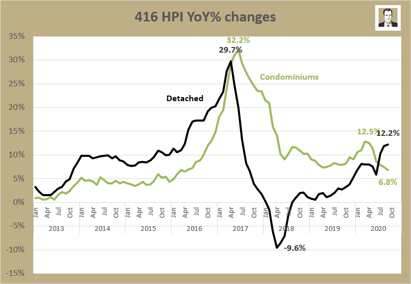 The condo apartment YoY figure of 6.8% is nothing to shake a stick at. If you could guarantee me 7% return on my investment portfolio for the next 20 years, or my house price appreciation, I'd take that in a minute. But it's the lowest figure since April 2016, or 53 months. The inevitable regression to the mean, IMO. I'm guessing the downward slope will contine for a several more months, and I think it's safe to say freeholds will remain higher than condos for a while also.