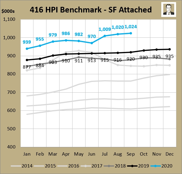 It's been really interesting to watch the rise of lowrise housing during a global pandemic. A lot of people have been talking about the "exodus to the suburbs" and "flight to detached" but single family attached (freehold semis and rowhouses) in the 416 have seen HPI rise $89K since the end of last year.