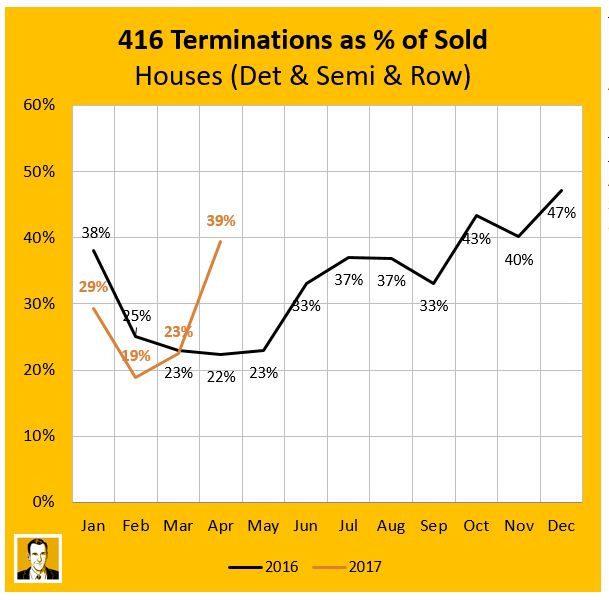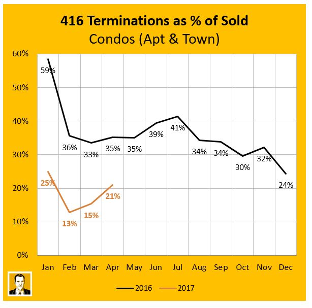 Take a look at the condo chart. I find it very interesting that terminations as a percentage of solds decreased in the second half of 2016, as houses were increasing. Looking at the 2017 numbers so far, there was a 6% up-tick from March to April, but that's less extreme than the 16% up-tick in houses. You'll also notice that condos are 14% below where they were last April, as opposed to houses which are 17% above 2016's number. So it seems condos are still selling well. In fact the months of inventory for 416 condos was just 0.9 in April, which was below the 1.2 months for houses (indicating the supply wasn't keeping up with the demand as well for condos).